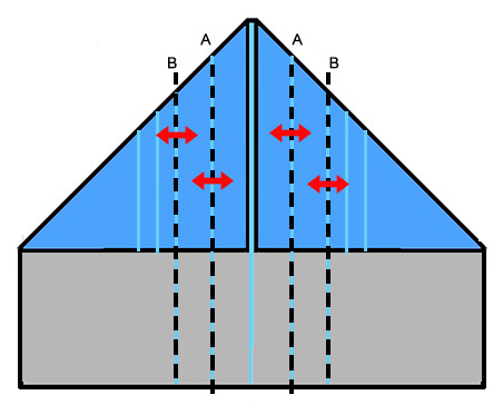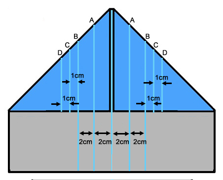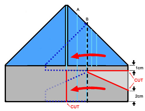 Step 4 With a ruler and a pencil, draw the cutting lines. Cut out a triangle section and a part of the center line. Fold the tail fin along the crease line B and insert into the center cutting. Fold to wing to the left along line B. |