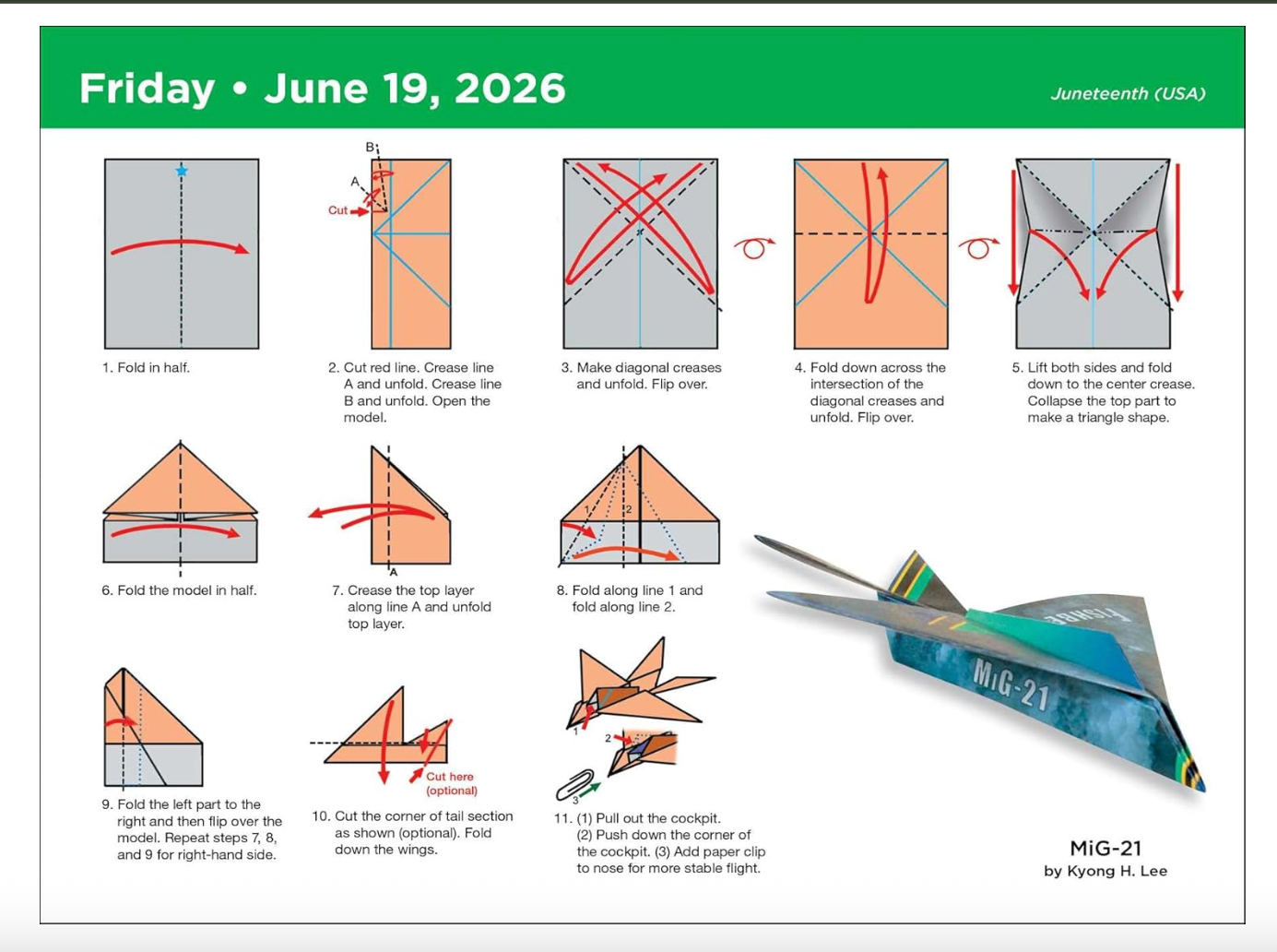 I have co-authored the FOLD-A-DAY 2026 CALENDAR. It includes my 20 designs and 20 more David Mitchell's designs. My designs include models based on real-life military planes––such as F-15 Eagle, Mig-21, Eurofighter 2000, SR-71 Blackbird plus commercial aircraft such as Airliner A300, Concord..