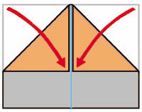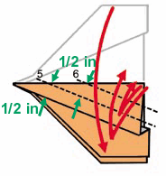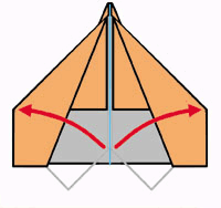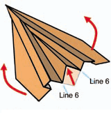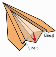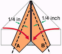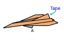 Step 7 The triangle flap A part may be used for a holding position for launching or can be used as landing gears. You may use a piece of double sided tape inside of the tail fin. Bend up the back of the wing for better flight. (Optional: If you use the downloaded patterned sheet, you may cut away parts of trailing edges as indicated in the sheet.) |